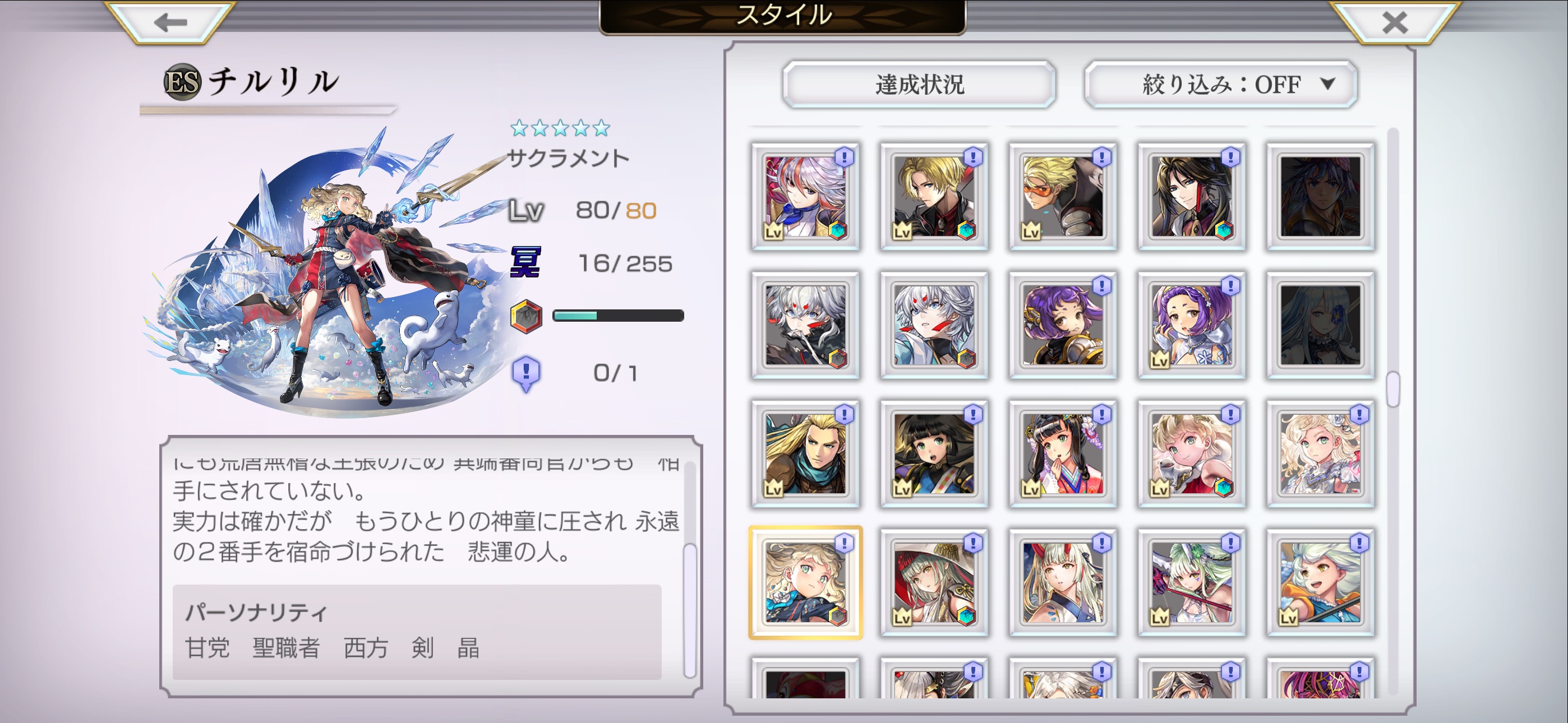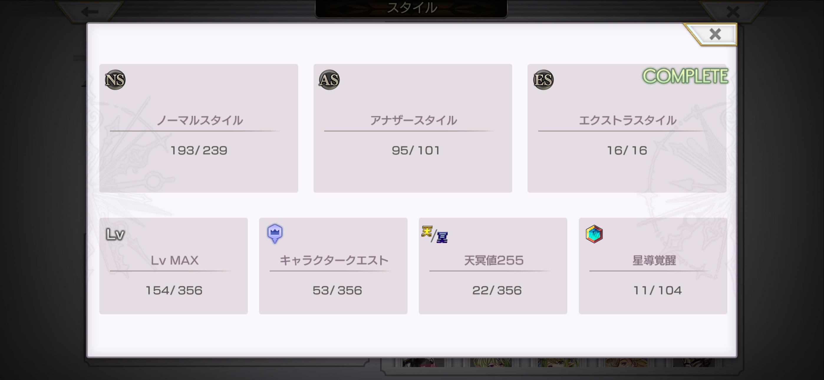 キャラクターとの出逢いや、スタイルごとの達成状況を確認することができます
